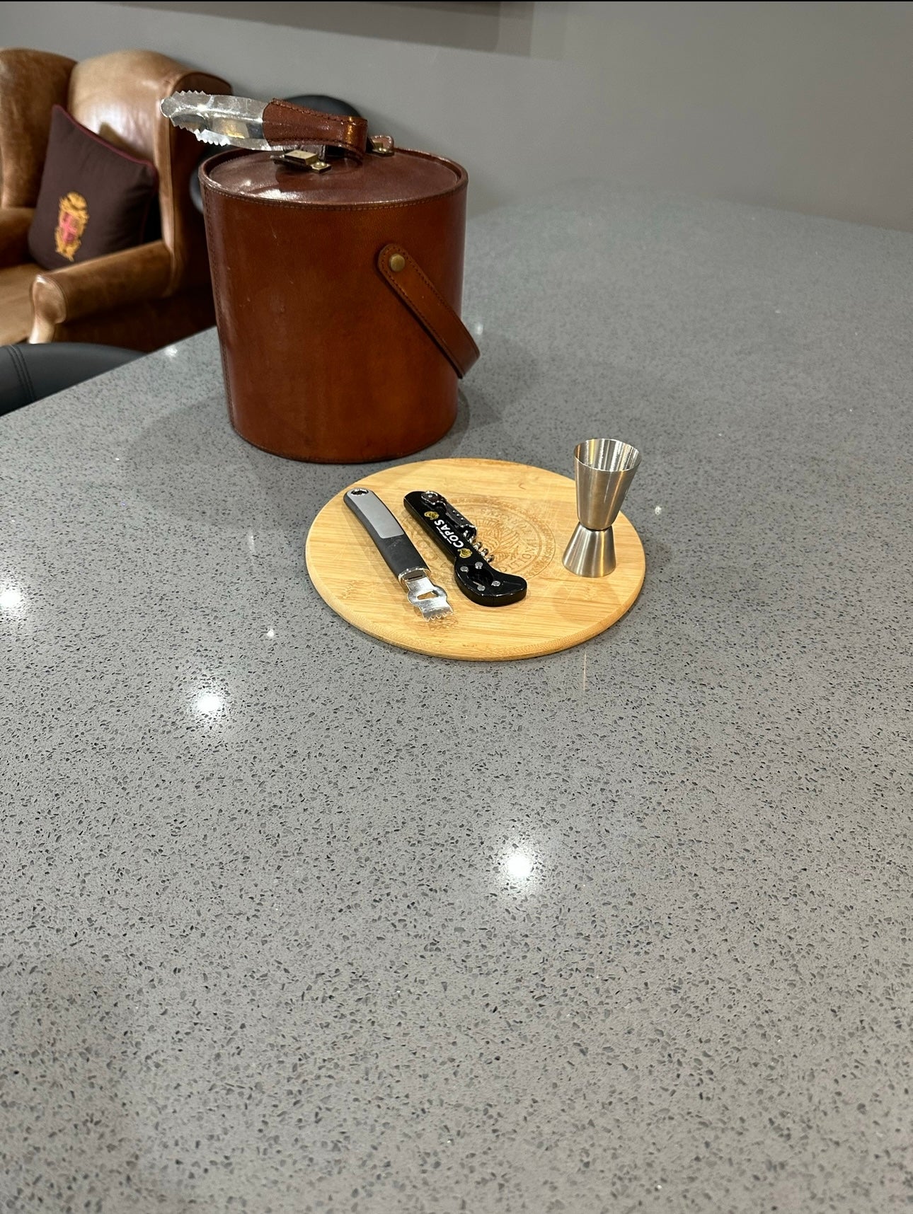 A grey Quartz Worktop Base, coverered in small mirror chips creating a real sparkle when illuminated.
